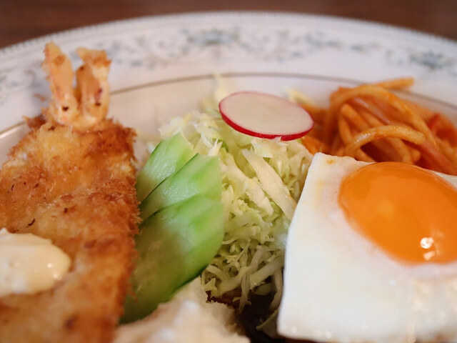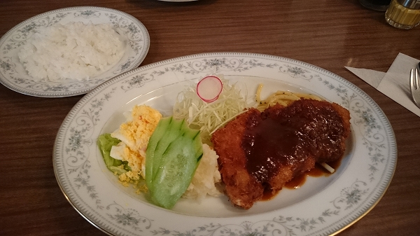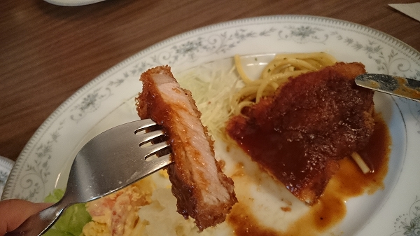 トンカツは薄い衣が剥がれず食感もサクサクで火の入れ方もよく、大変おいしい。豚肉がいいものだろう、旨味があって風味もかなり良かった。ソースは酸味があるデミグラスで、エビのサラダは白身と黄身が分けて合わせれられてて、昔お出かけしてて晩飯などで食うちょっと高級な洋食屋さんの味付け。添え物のスパゲティもカレー味に酢の酸味があって、口をリセットする仕事がされた付け合わせ。
