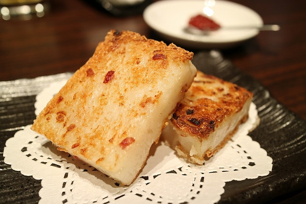 豆板醤をつけて食べます。大根の風味ともちっとした食感の中のしゃりっと感もあり美味しい