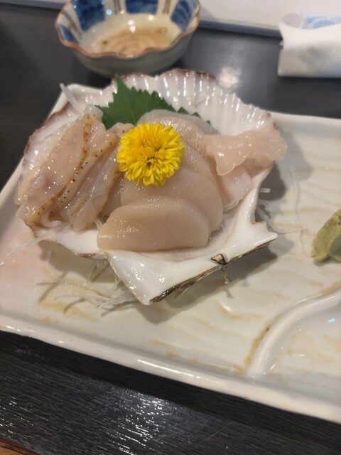 オーダーは、ひらまさとホタテの刺身にカンパチ頭焼き、そのあと桃川二杯頼んで茗荷酢漬けで終了。