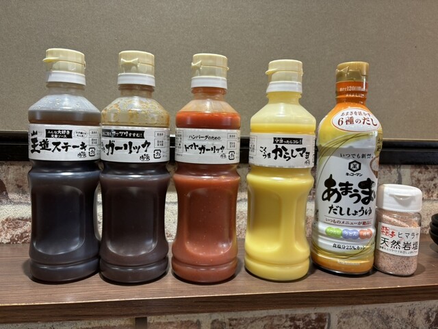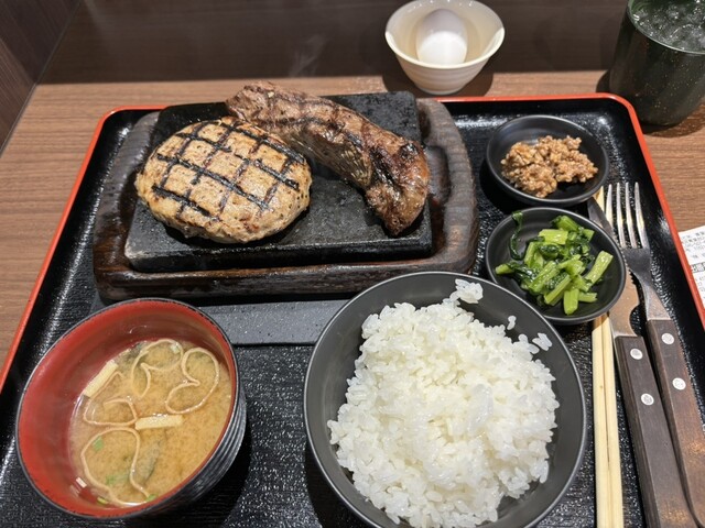 ハラミステーキなどのお肉もガツンとしつつ柔らかくて、ソースもたくさんのものを選べますから味変も自由自在。ご飯やお味噌汁もセルフでおかわり自由、牛しぐれやキムチに葉物などの付け合わせもおかわり自由、生卵お一人1個どうぞと、お腹が満たされないわけがないですね〜!