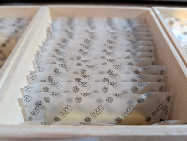 久々に乙川の名店、久遠チョコレートに来ました。いつもスポーツクラブでお世話になるスタッフの松嶋菜々子そっくりのあの子のハッピーバースデーのプレゼント用にこちらのチョコレート6種類を1枚ずつ購入して袋に入れてプレゼントしました。購入したのは以下の6枚。