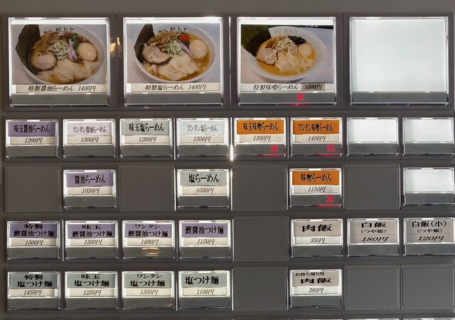 らーめん(1050円)、味玉(1200円)、ワンタン(1300円)、特製(1400円)