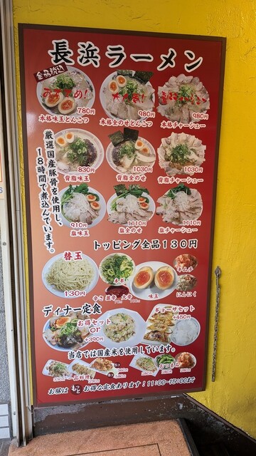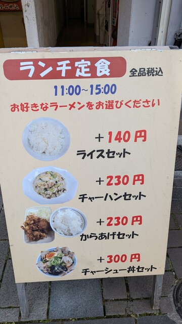 店前にランチセットの立て看板、階段横の壁にラーメンメニュー