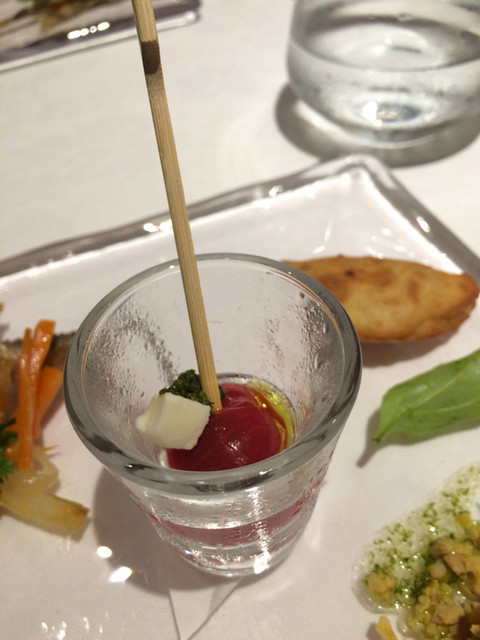 3つあるコースの真ん中、地のコースをオーダー。お通し、前菜盛り合わせ、パスタ、メイン、デザートとカフェ、パンがつきます。