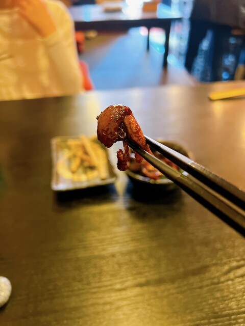 うなぎ数十匹分のきもを香ばしく焼き、甘辛のタレに潜らせてから提供されます。