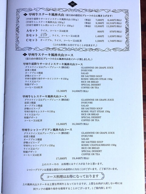 ★甲州牛ヒレステーキ風林火山コース 13,180円