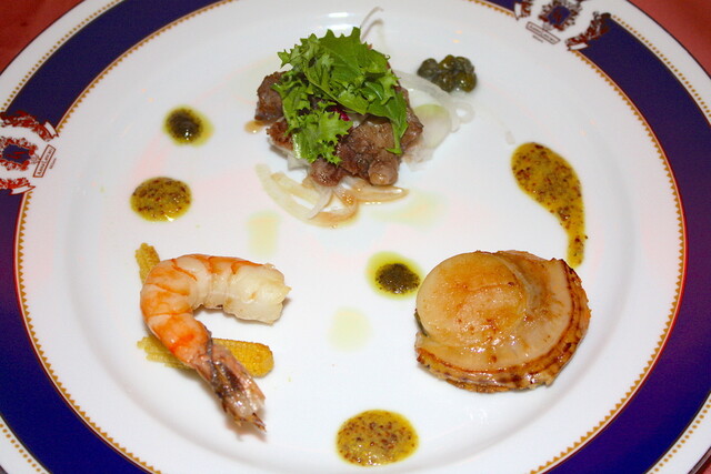 次はオードブル3種盛で牛海老ロティーと北海道産帆立ロティーとローストビーフ大葉乗せ