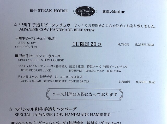 おひとり様でベリマリンに甲州牛100%のハンバーグを食べに行きました。