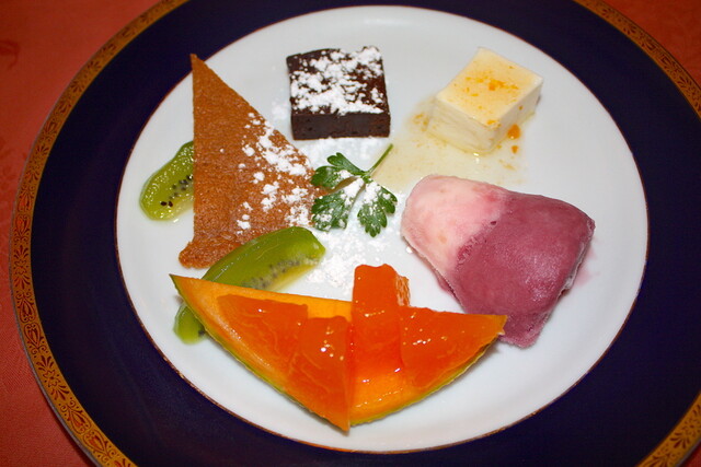 デザートは夕張メロンに富士山型桃とブドウのジェラートに
