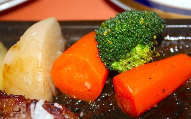鉄板にあるニンジンとポテトは斜度切りで軽く味付けしてあり旨いです。