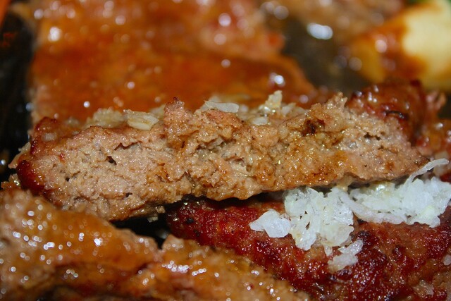 まずソースが付いてないところを切ると肉汁も出てきて和牛100%の上品な美味しさが分かります。