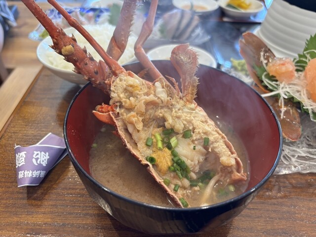 伊勢海老を食べに大原へ。伊勢海老は1,000円/100g。写真の大きさで約700g。みそ汁は150円で2杯作ってくれました。