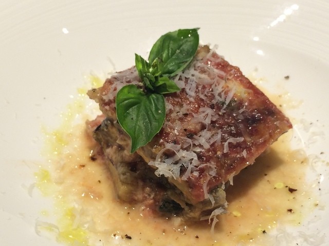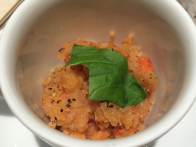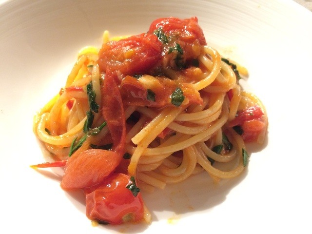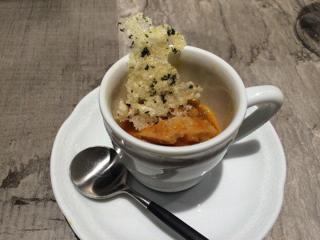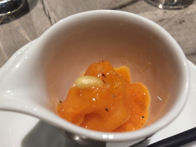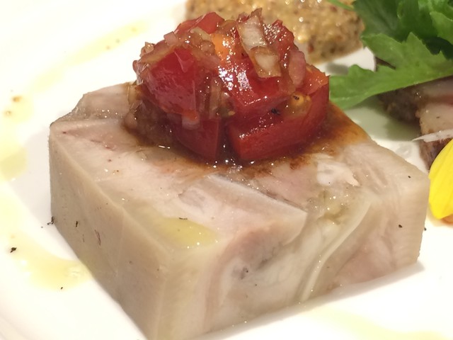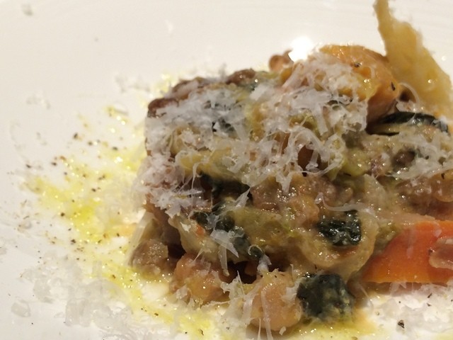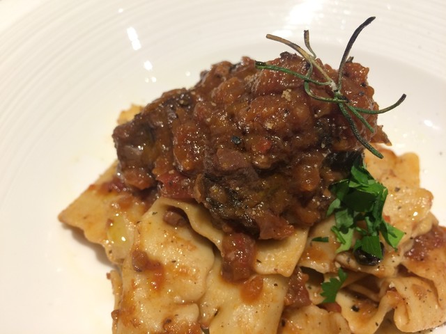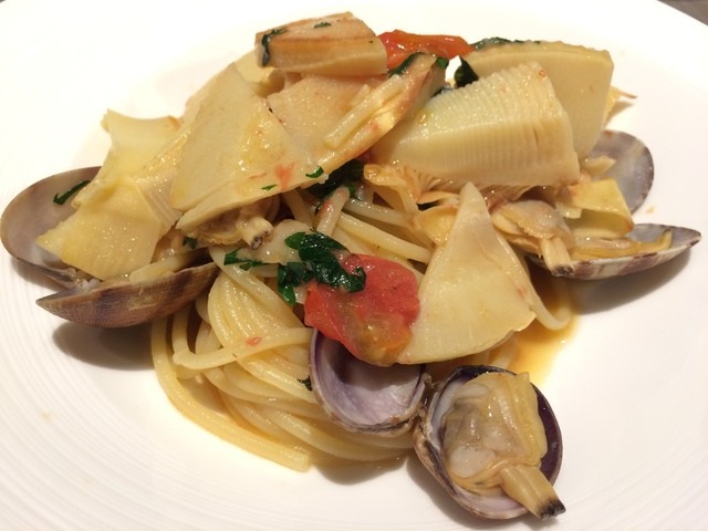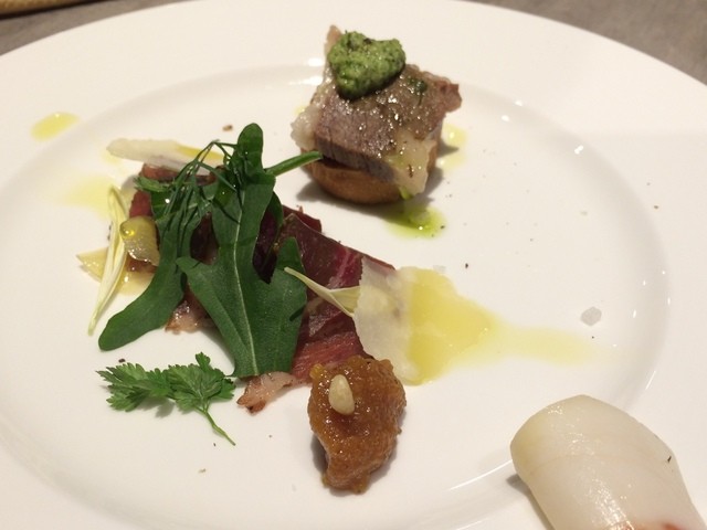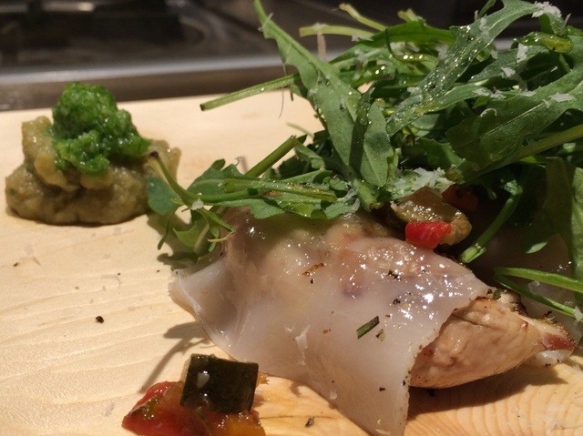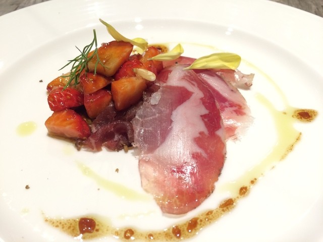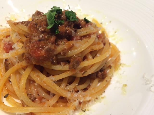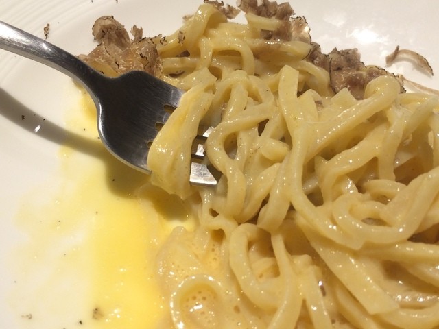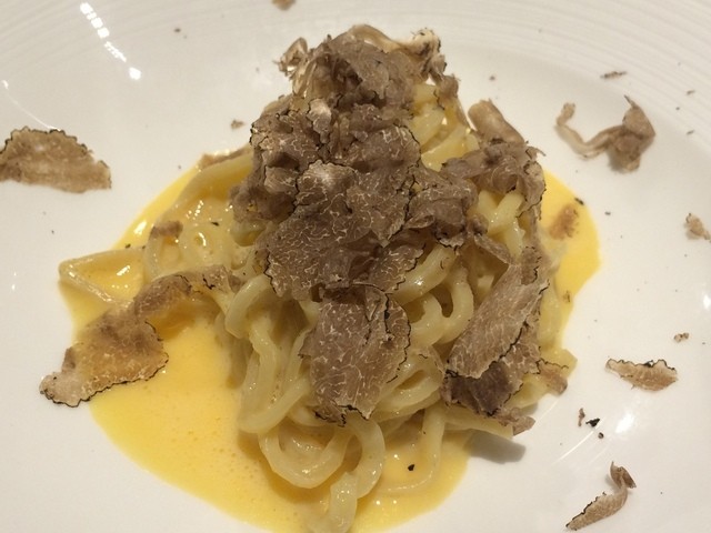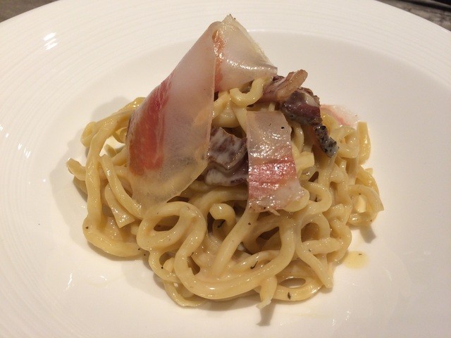 火を入れたダシがジュゥジュゥ出ているグアンチャーレが手打ちパスタにまとわりついて、まとわりついて、さらに生のグアンチャーレが上にのせられて、極上のアブラが解けて透き通って、キャーな風味。トローリかと思ったらサクッな歯ごたえで、見た目も味も触感もPERFETTO!