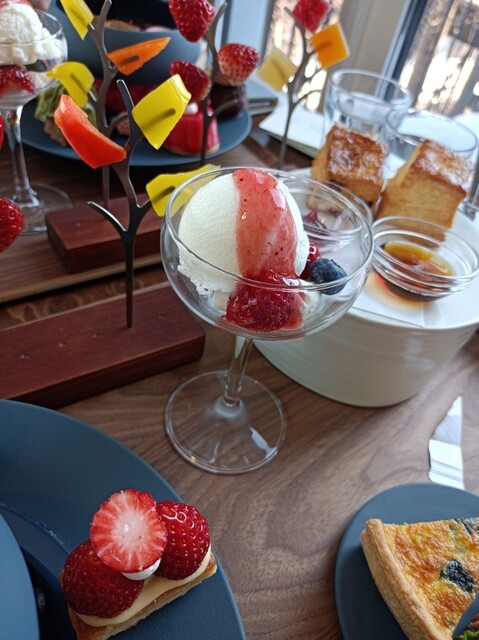セイボリーは和風のキッシュ、サンドイッチ、パプリカのピクルス、スコーンなどなど。これはめっちゃ味変にサイコーでした!ピクルスも酸っぱすぎなくてイクラでもパクパクいけちゃう。キッシュは味薄めだけど、それくらいが私には丁度良く。スコーンは2種あり、プレーンのと、ベリーのです。ジャムがこれまた美味しくて!