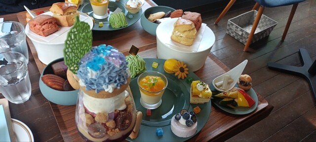 ほうじ茶のシフォンケーキが今日イチの美味しーでした‼️甘すぎなくて、でもフワフワーで栗❓かなぁ。もゴロゴロ入っていて。あとはたらこクリームパスタもモチモチで味付けも好きでした。エビもブロッコリーも結構入ってます。あとドリア初めて食べましたが、かなり濃厚!チーズたっぷりーで、甘いケーキ食べて、またドリア食べてーの、パフェ食べてーのまたドリア一口食べてーの。無限ループ突入でした。あー幸せ感じました。