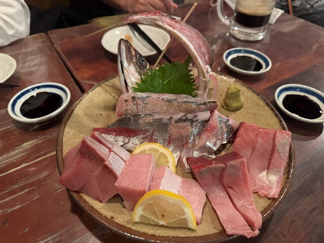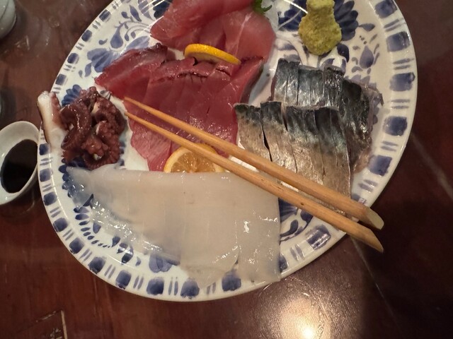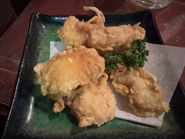 お店集合で一番乗り。看板メニューからアオリイカげその天ぷらとサバフライを先にオーダー。揃ったときに、一人サバアレルギーと言うことを思い出しましたが後の祭(笑)特大のサバフライを二人で平らげました。アオリイカげその天ぷらも大きいし、この二品だけでも大満足。毎度の事ですが、どうやって家に辿りついたのか全く思い出せない私でした…