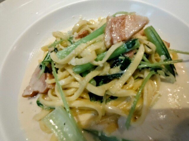 限定10食の生パスタでベーコンと青野菜の白味噌クリームパスタ