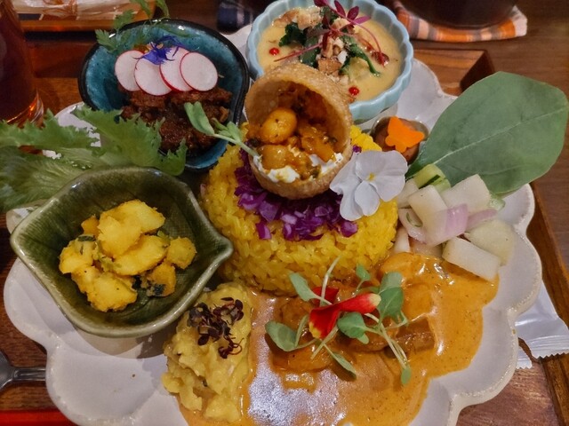 レタスや青菜にターメリックライスとカレーを乗せて包んで頂いたりいろんな食べ方を楽しめました。