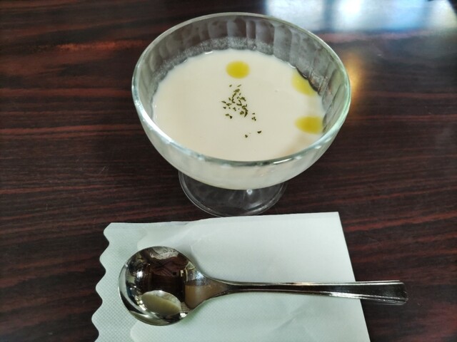 ビシソワーズの冷製スープにドリンクはレモンスカッシュにしました。