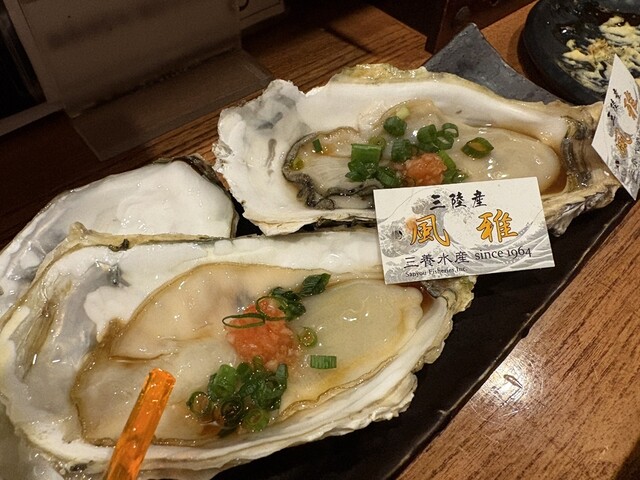 続いて海鮮ばくだん、なめろう、海鮮ユッケ、ブリ(カンパチ)のカマ焼き、炙りポテサラ、牡蠣など海の幸のオンパレード。どれも丁寧で旨みが深く、魚が得意な居酒屋だと一撃でわかるラインナップ。