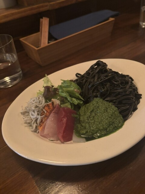 イカスミパスタに4種のお刺身、そしてネギ味噌が添えられました。