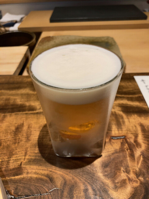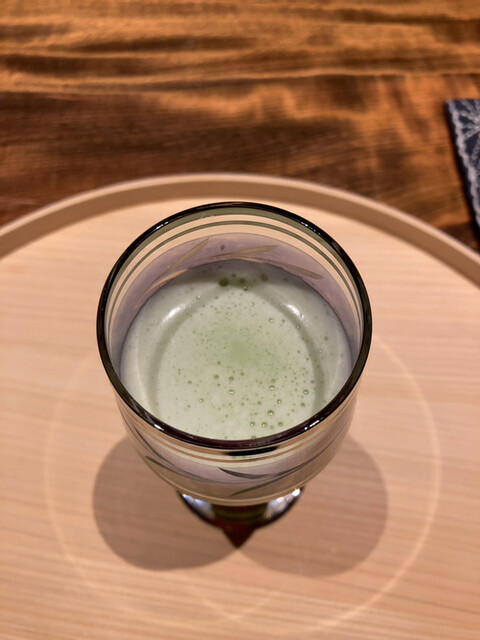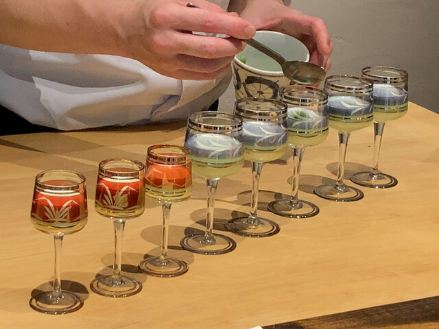 お供は自家製梅酒のソーダ割りとお料理に合わせたお茶のペアリングで。