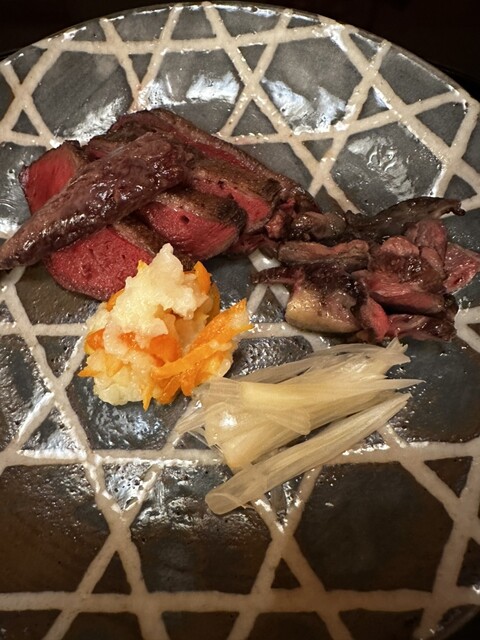 きな粉をまぶした新生姜、赤エンドウの芽の粒マスタード和えを添えて。山葵と醤油でいただきます。炭火で焼かれた塊を切り分けてくださいます。柔らか!