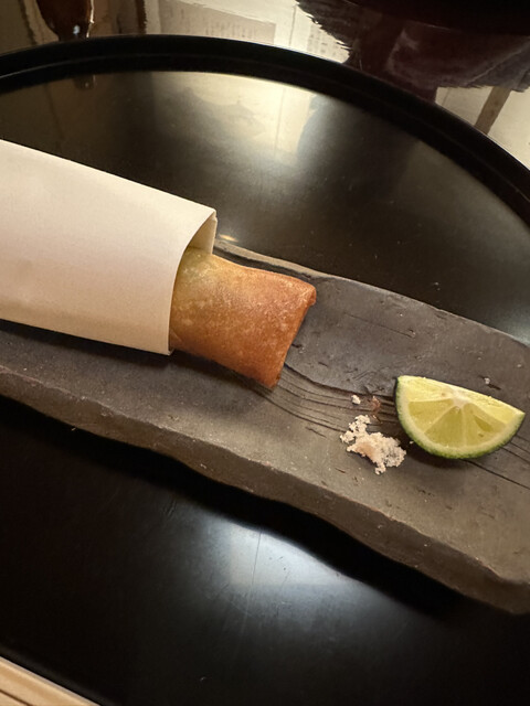 揚げたて熱々の春巻には大好物が詰まっています。塩と酢橘で。