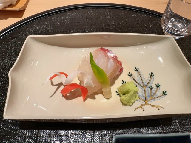 明石の鯛。旨みといい、脂の乗り具合といい、バランスがいいです。芽出たいにかけて甘草。
