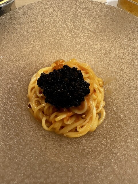 キャビア雲丹素麺。キャビアがこんもり!キャビアには別皿が添えられ、取り分けてちびちびといただきます。素麺は冷麦との中間の食感。軽く和えて。