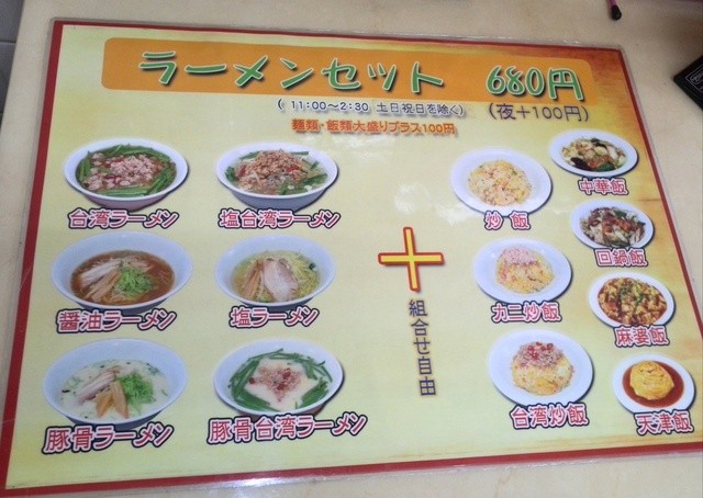 事前に食べログで予習していたので中国の方と思われる店員さんに確認すると「できる」ということで、台湾ラーメンと塩ラーメンをチョイスして注文完了。