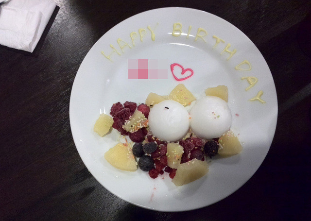 最後に誕生日のサービスデザートということで写真のようなデザートをいただき、白いアイス状のものはライチのシャーベットで、私も味見をしましたが本当に口さっぱりという感じで、このようなサービスをしていただいたことに加え、これまたおいしさに感謝感激といった気分になりました。