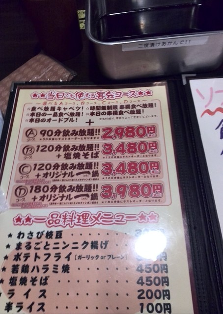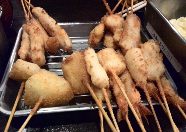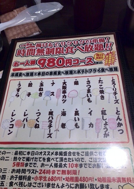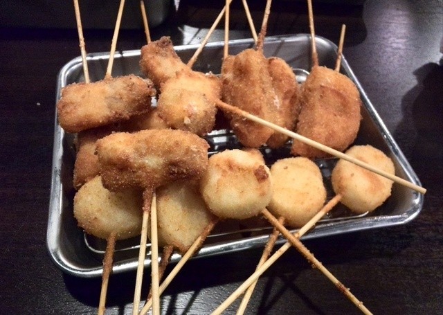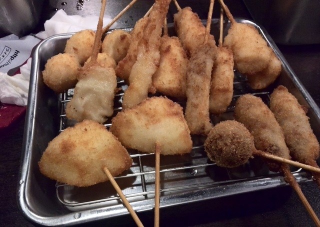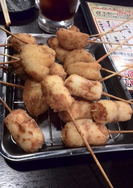 串揚げは18種類プラス本日の食べ放題メニューということで、別に3種類の串揚げと春雨サラダやスパゲッティーサラダ、フライドポテトなんかも食べ放題で、串揚げの中ではチーズインのものがおいしく、豚バラチーズとちくわチーズがおいしかったです。