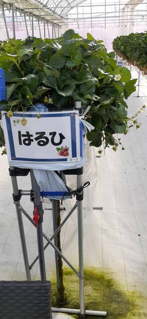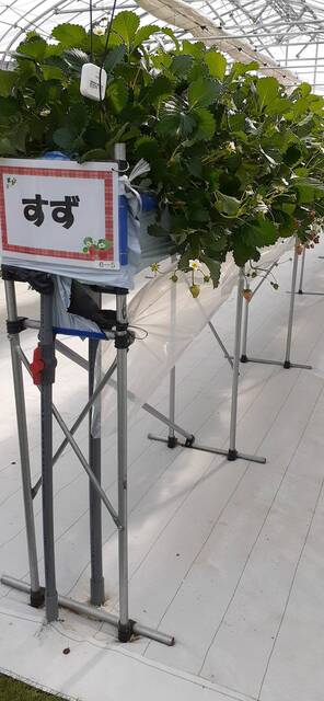いちごは畑のようなものではなく、120cmほどの棚になっていて、立ったままいちご狩りができ、通路には大きめの椅子が置いてあって、座って休憩しながら楽しむことができます