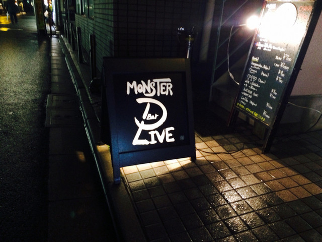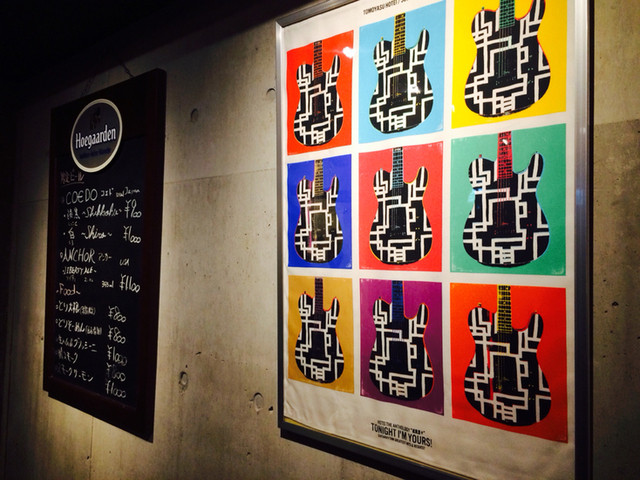 この度は念願叶って新潟の地よりモンスタードライブさんへ初参戦できました!新宿駅西口から歩くこと7〜8分でお店の前に到着。外のショーケースに布袋アニキが使用するギターのミニチュアが!!!それを見ただけですでにテンションMAXに(笑)地下へと続く階段脇の壁には角材で型どられた布袋アニキのやはりG柄。店内に入るとG柄のポスターにまたまたミニチュア。ウイスキーの下に敷かれたコースターもG柄。テレビ画面にはアニキのLIVE映像。カウンター席にはアニキの予約席が!