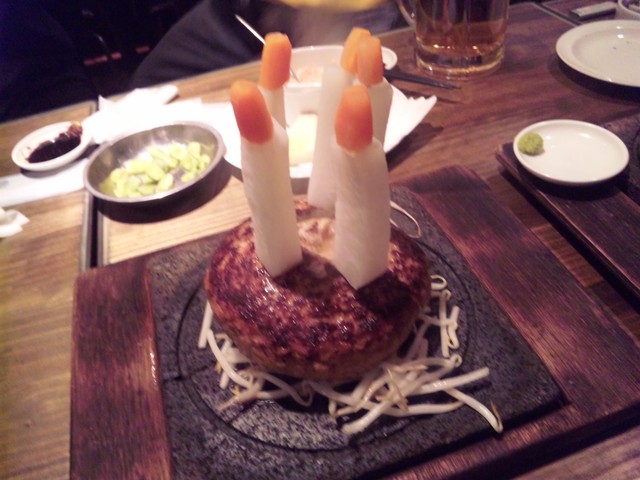 ハンバーグに、大根とニンジンで出来たローソクが刺さって登場してきました (●´∀`)/