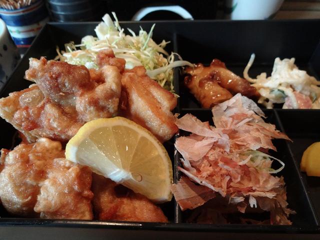 揚げたて熱々の唐揚げは衣がパリッとしていて、柔らかい肉は繊維状に裂ける感じでとても美味しい。醤油を少しとレモンをたっぷり絞って頂きました。手を拭きたいけどティッシュしかないな。
