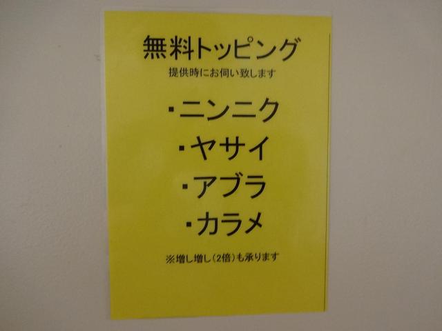 外に出ていた看板に並は200g、大盛は300gと書いてあったのでいけるだろうと思いましたが、席の前に貼られていた貼り紙に「通常のラーメンと比べて麺量は1.5倍」「大盛は食べ残し厳禁」と書かれていたので怖じ気づきヤサイ増しはやめておきました。トッピングはニンニクちょい増しのみで。