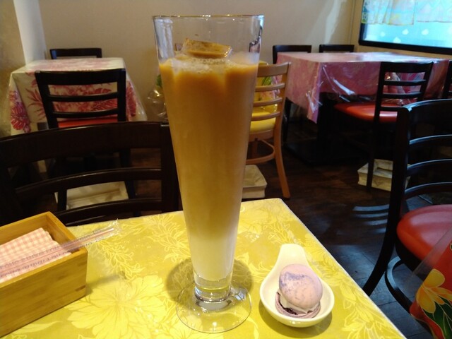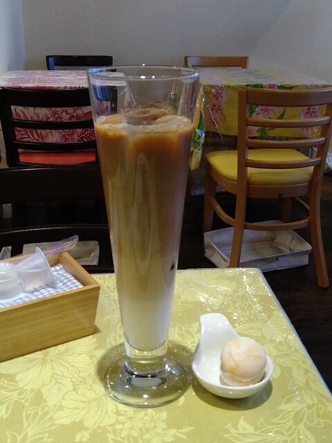 食べている間に先客が出て暫く1人でした。長いグラスに入ったロイヤルミルクティーをのんびり楽しむ。珍しいドリンクのサービスの通り、ランチ14時以降の集客って難しいのかも。看板が小さくて目立たないからかな。