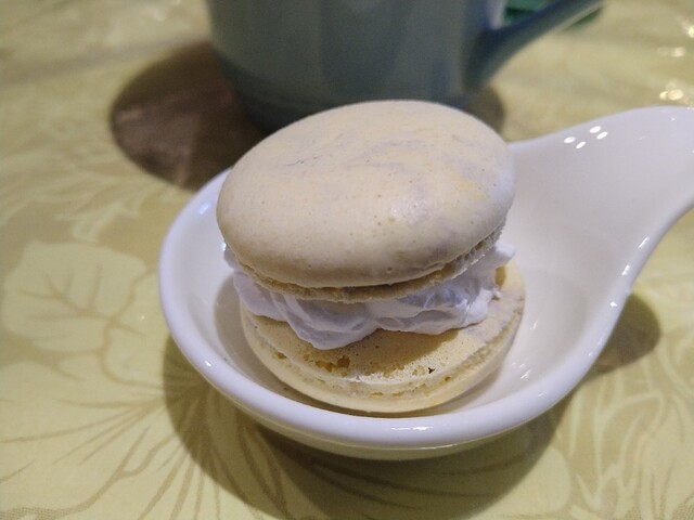 食べ終わる頃にドリンクと、なんと手作りのココナッツマカロンが運ばれてきました。えっ手作り?!クオリティが凄い。マカロンって数えるくらいしか(そして有名店のしか)食べたことないけど、お世辞抜きにこれまで食べた中で一番美味しい。ココナッツの風味が優しくて甘すぎず、ふっくらして口どけがよく、生クリームが挟まっています。厚みがあるので上下に分けて頂きました。