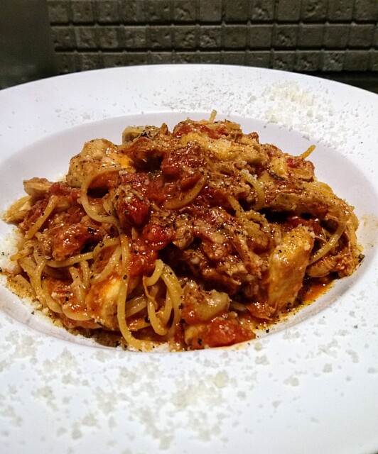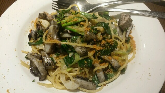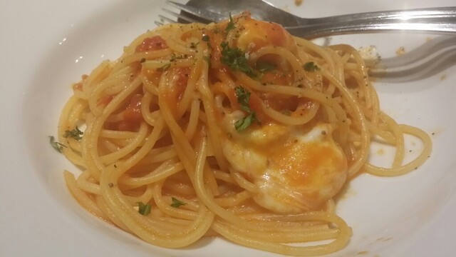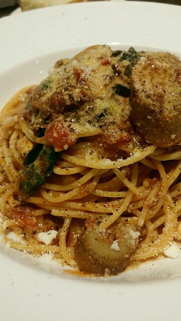 牡蠣とトレビスのトマトスパゲティ大盛り