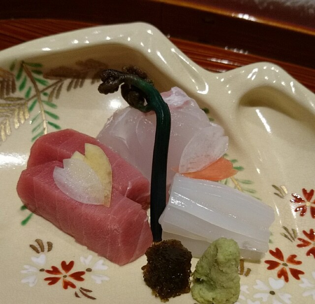 ・お造り 長崎定置網鮪、玄界灘の平目、江戸前スミイカ