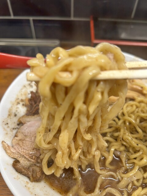 モンナカブラック大盛り ニンニク追加 胡椒たっぷり 具は、チャーシュー、ほぐし豚、メンマ、玉ねぎ