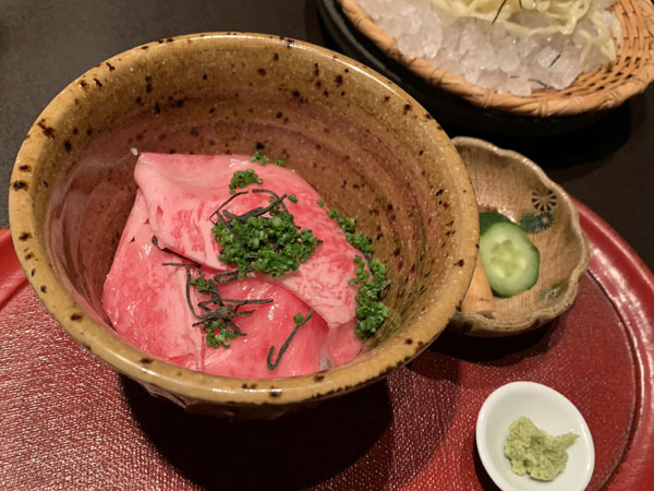 ウニは期待通りに甘くなめらかで、よだれ鶏のソースも絶品。肉茶漬けはだし汁がかけられて熱が加えられた牛肉がすごく美味しくて、だし汁はだし汁で美味しくて、この組み合わせが美味しくないはずがないのです。
