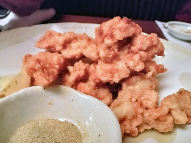 お通しは加賀蓮根の唐揚げ。意外にほっこり揚がってシャキシャキ感とのバランスが面白く美味しいけど、かなり糸を引くのに閉口。