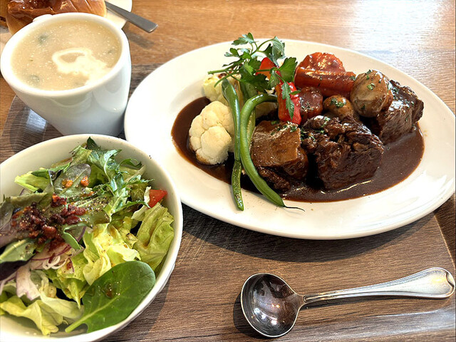 ビーフシチューはすね肉をじっくり煮込んであり、味は言うまでもなく、肉も野菜も軽く箸をいれるだけでほろりと崩れます。