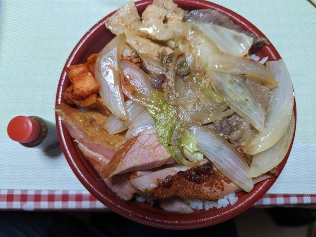 ハーフ丼はホルモンとカルビのハーフ&ハーフに厚切りベーコンという肉まみれ。