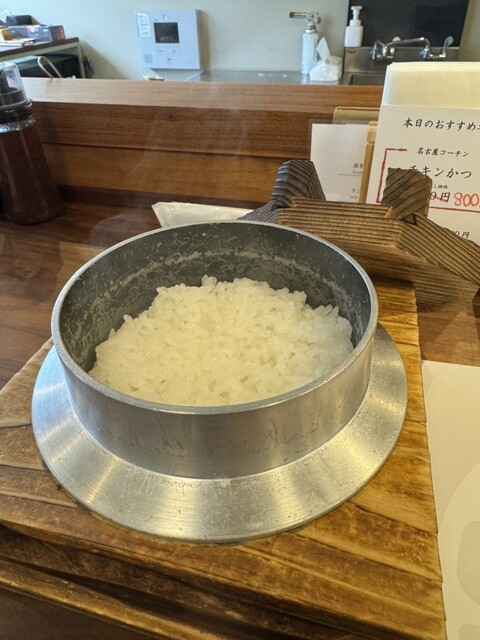 家の近くながら、なかなか来れなかったこちらを訪問。口コミより10:00から整理券を配るということで、10:00に行きましたがすでに先客3組…恐るべし。無事に整理券4番を頂き、11:00の10分前に再訪問し、店内へ。カウンター8席で、目の前に鍋がありライブ感があって良いですね。奥には釜炊きのご飯のガス台があり、あーやって炊くんだと感心しつつ、オーダーは、以下