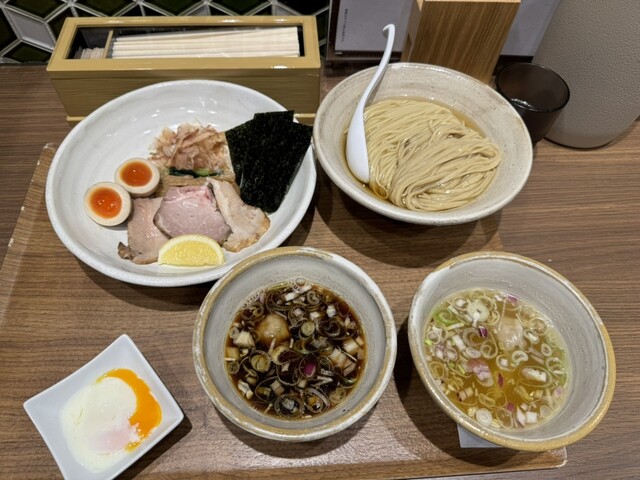先輩お勧めのつけ麺、塩と醤油のダブルスープ、トッピング特上、薬味を味玉でオーダー。特上にすると麺が細麺と平打ち麺の2種類になるようです。