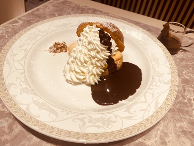 生クリームとカスタードがたっぷり添えられ、とろーりチョコレートと絡めながら食べるシュークリームはボリュームも味も大満足!